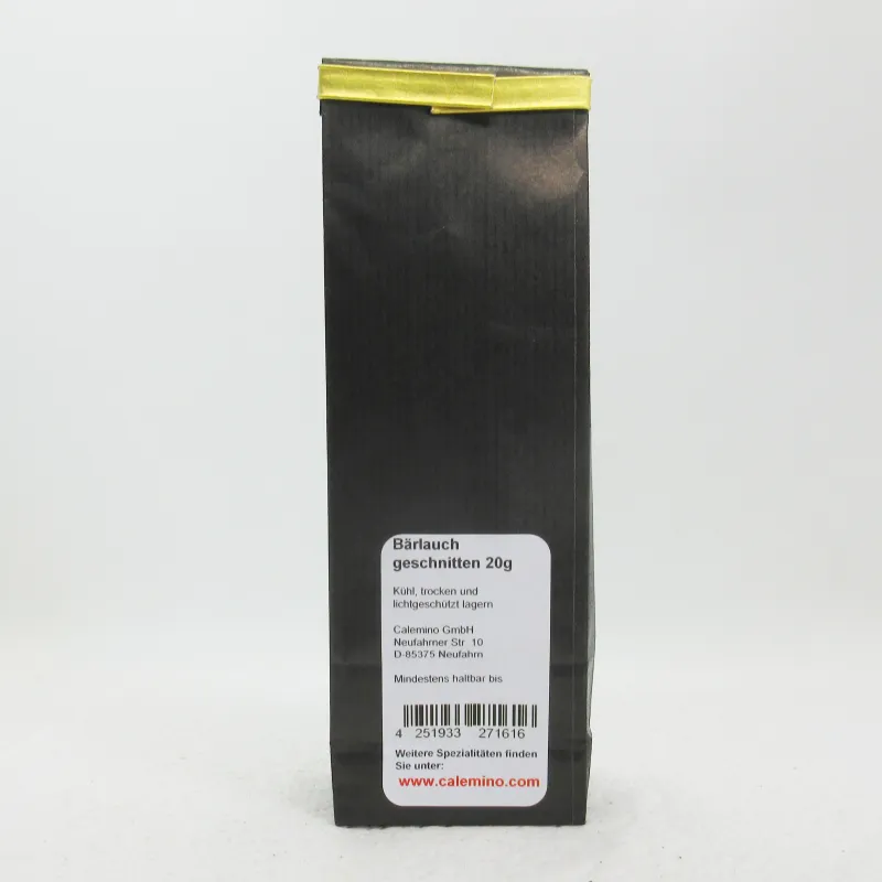 Unser geschnittener Bärlauch wird in einem aromadichten, wiederverschließbaren Beutel mit Sichtfenster und praktischem Clipverschluss verpackt. So bleibt die Frische lange erhalten und die Dosierung gelingt mühelos.