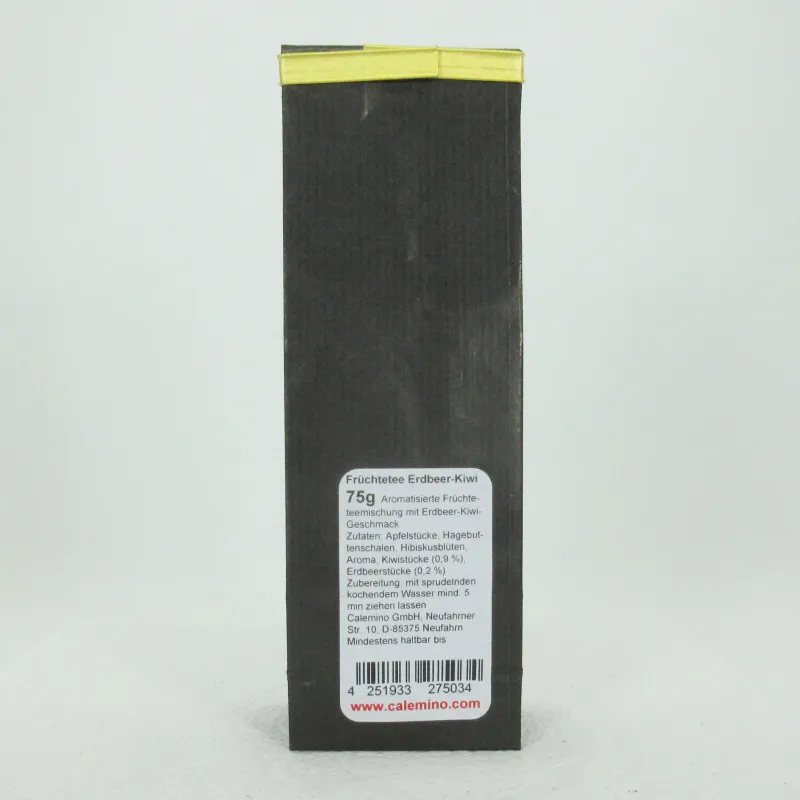 Zutaten: Apfelstücke, Hagebuttenschalen, Hibiskusblüten, Aroma, Kiwistücke (0,9 %), Erdbeerstücke (0,2 %) Aromatisierte Früchteteemischung mit Erdbeer-Kiwigeschmack